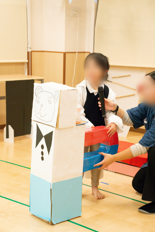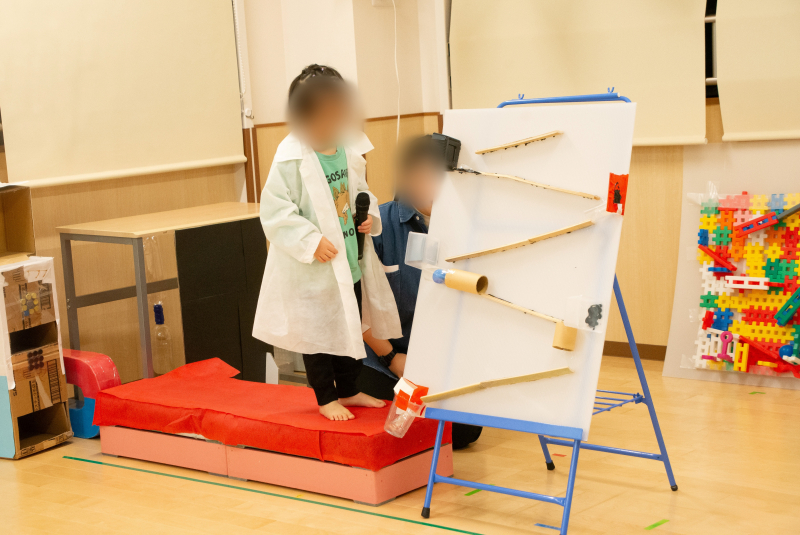 10月に遠足で「みなと科学館」行き、様々な科学実験やプラネタリウムを体験し、保育園でも再現してみようと、実験やプラネタリウム作りに挑戦した子どもたち。また、日頃から楽しんでいるピタゴラ装置を、自分たちでも作ってみたいと、井形ブロックや竹などを使ってオリジナルピタゴラスイッチを作りました。